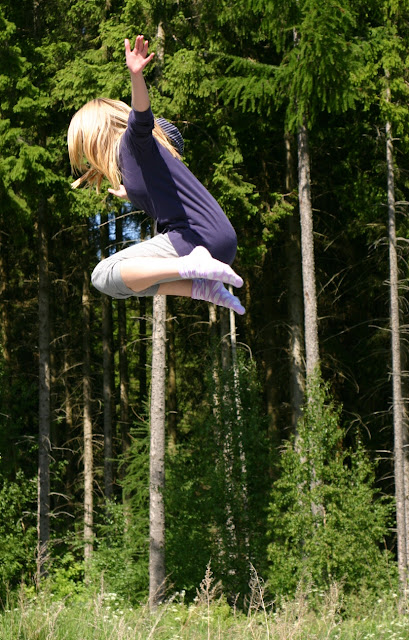 Tittar på film efter film, går inomhus med klackarna som ska användas på skolavslutningen, funderar på vilken färg som ska pryda naglarna, tar kort på syster och hoppar själv på den hyfsat nyanlända trampolinen.